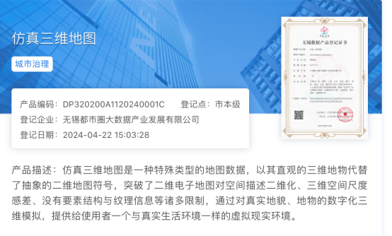 近日,都市圈旗下的无锡都市圈大数据产业发展有限公司在江苏无锡大数据交易有限公司(下称锡数交)完成仿真三维地图产品登记。